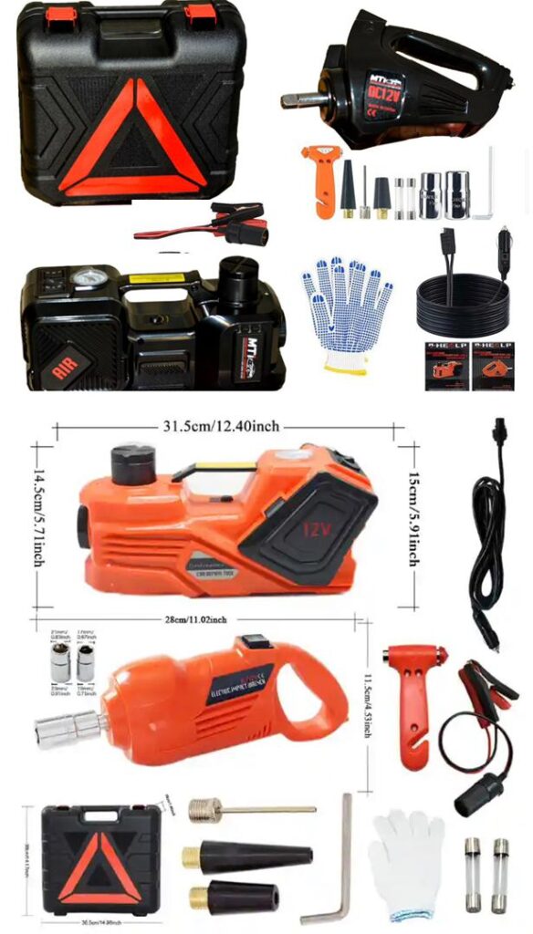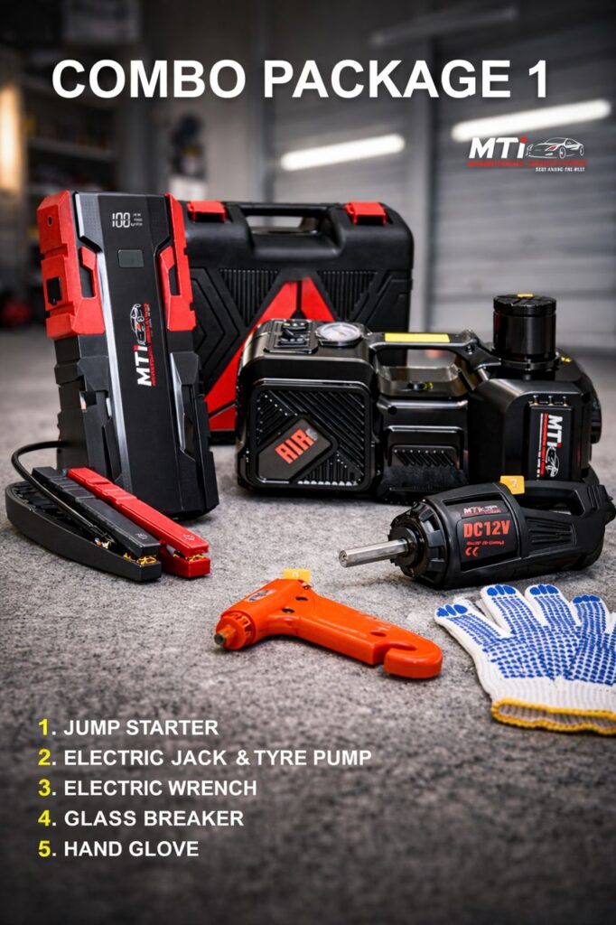 You’re on the expressway, it’s dark, your tyre is flat. The electric jack lifts the car, the electric wrench removes the bolts, the inflator tops up your spare. Back on the road in under 10 minutes — no mechanic, no stress.