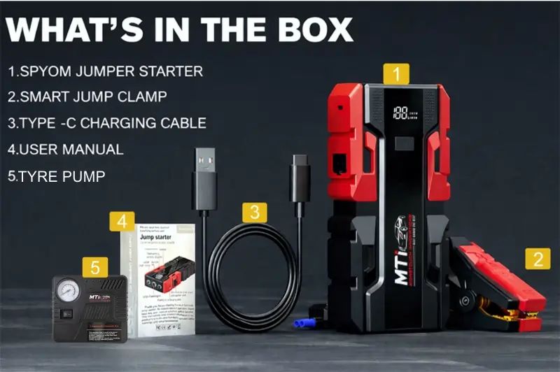 The small connector at the bottom plugs into a portable jump starter or power bank. Once connected properly, it transfers power from the jump starter to the dead battery so the engine can start.